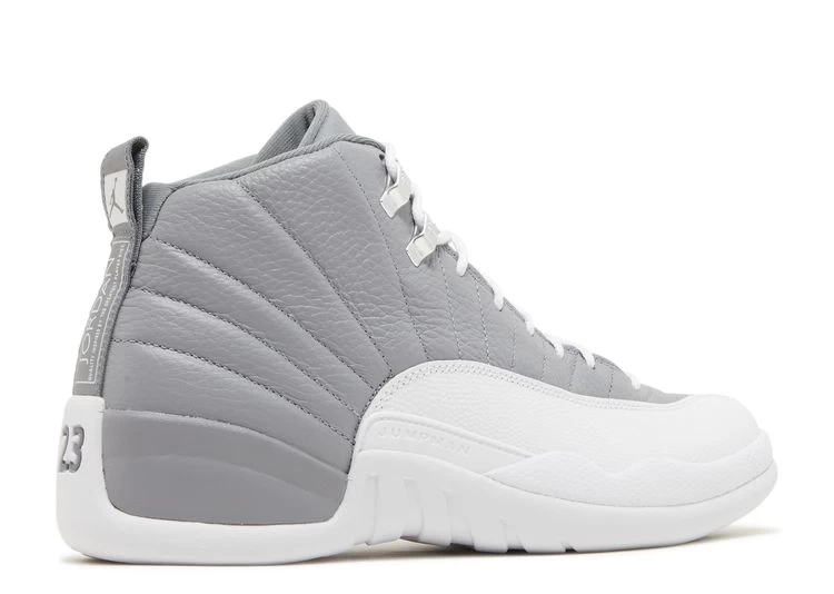 The Air Jordan 12 Retro ‘Stealth’ brings a neutral color palette to the historic silhouette that introduced Zoom Air cushioning to the Jordan line. The grey tumbled leather upper features the 12’s signature stitched lines and a lizard-textured overlay in a solid white finish. Signature Jumpman branding appears on the tongue and heel tab. The mid-top rests on a lightweight Phylon midsole, supplemented by a full-length Zoom Air unit and supported by a herringbone-traction rubber outsole.