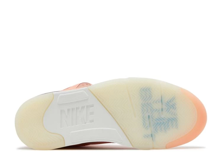 Drawn from the collaborative ‘We the Best’ collection, the DJ Khaled x Air Jordan 5 Retro ‘Crimson Bliss’ gives the classic silhouette a pastel makeover. The upper is crafted from coral-hued leather with a satiny quilted lining in Leche Blue. Matching blue embroidery appears on each heel overlay, featuring a Nike Air logo on the right shoe and ‘We the Best’ inscribed on the left. Traditional Jumpman branding decorates the silver reflective tongue. The sneaker is mounted on an off-white polyurethane midsole with blue speckled shark-tooth detailing and a visible Air-sole unit in the heel. Underfoot, translucent rubber outsoles reveal mismatched Jumpman and ‘We the Best’ branding.