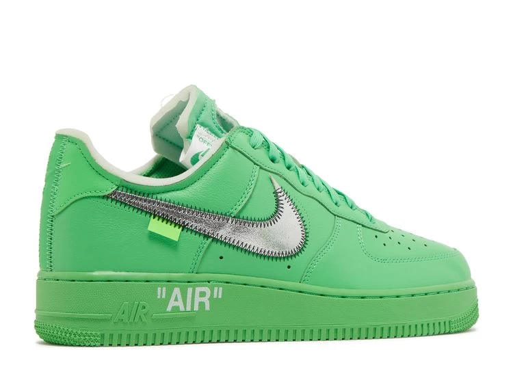 The Off-White x Nike Air Force 1 Low ‘Brooklyn’ brings back the same color blocking and details featured on previous AF1 collaborations, including the 2019 ‘MCA’ release in University Blue and the 2021 ‘Lemonade’ colorway in University Gold. This pair makes use of a bright green leather upper with exposed foam construction on the low-cut collar and tongue. Silver foil Swooshes are outlined in black zigzag stitching, with the medial-side check obscuring Off-White’s signature Helvetica text branding. The sneaker rides on a matching green rubber cupsole, highlighted by ‘AIR’ stamped on the lateral sidewall.